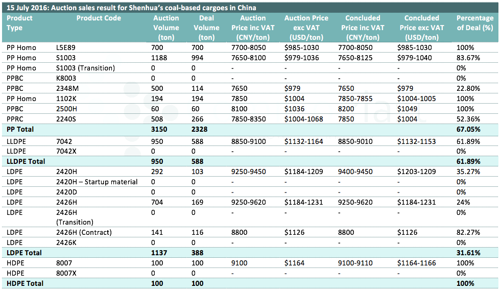 15 July 2016: Auction sales result for Shenhua's coal-based cargoes in China