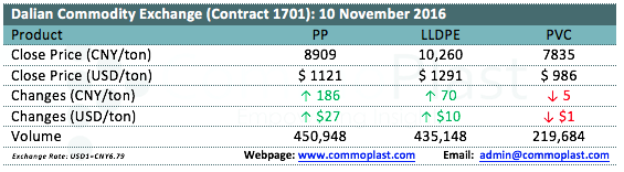 Dalian Commodity Exchange: 10 November 2016