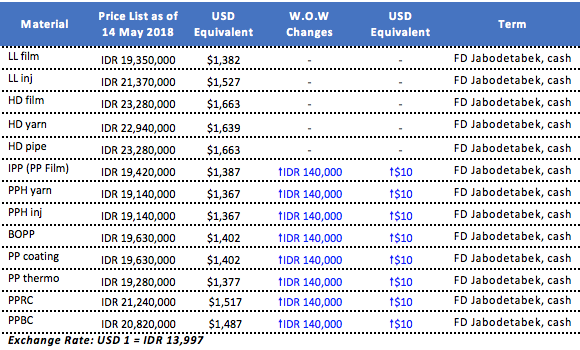 It is reported that a major domestic producer in Indonesia has announced fresh PP and PE offers on the first trading day of the week. The latest price list indicated $10/ton increased on all PP cargoes while PE remained unchanged compared to last Friday.