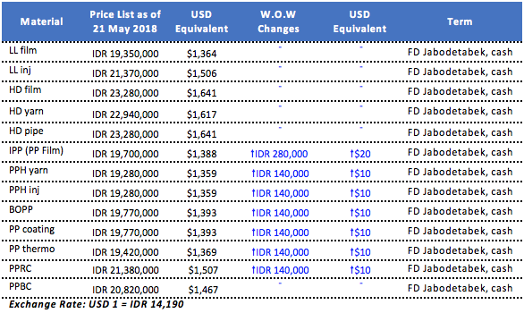 A major domestic producer in Indonesia has announced fresh PP and PE offers to local buyers at the stable to firmer levels compared to last week. Sources attributed the hike to the recent weakening of the Indonesian Rupiah against the US dollar, however, feel a little surprise on the price decision for PE.