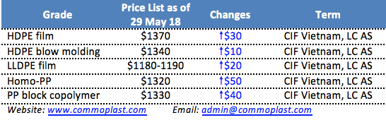 Another Saudi Arabia producer has announced June shipment offers for PP and PE to Vietnam with increases, market sources reported on late Tuesday, 29 May 2018. The largest increase recorded in the latest offers is for homo-PP cargoes, which see $50/ton up from last month.