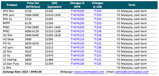 Malaysian buyers reported to have received fresh PP and PE offers for June 2018 delivery from a major local producer with MYR200/ton ($50/ton) increased for homo-PP, BOPP and PP block copolymer, MYR150/ton ($38/ton) for LDPE and HDPE all grades except injection with MYR100/ton ($25/ton) increased and HDPE, whereby HDPE injection as compared to previous month.
