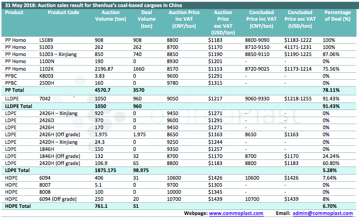 31 May 2018: Auction sales result for Shenhua's coal-based cargoes in China