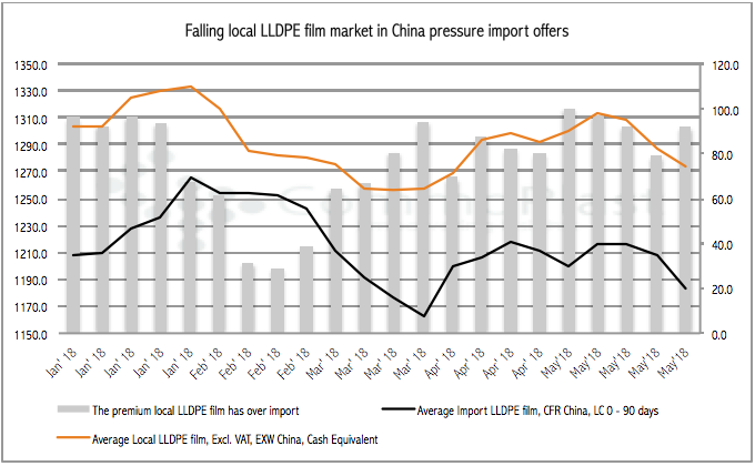 “We stepped back on LLDPE film offers to China by $40/ton to $1250/ton CFR China, LC AS term, and yet, sales were rather disappointing. The market is not responding to the fact that ethylene costs are high,” a Thailand market commented on last Friday, 1 June 2018.