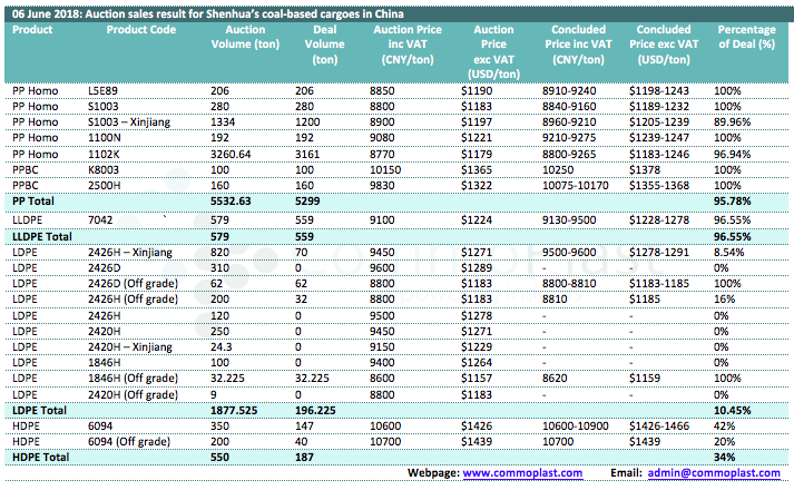 06 June 2018: Auction sales result for Shenhua's coal-based cargoes in China