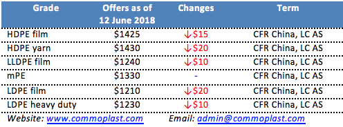 It is reported that a major Thailand producer has announced fresh weekly offers for PE to China with a reduction of $10-20/ton compared to last week. Chinese buyers are not surprised by the cuts citing the recent softness in purchasing interest while several major Middle Eastern producers have pioneered the trend in the previous week.
