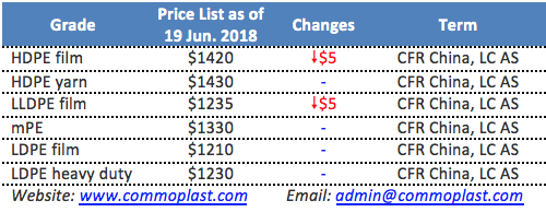 A major Thailand producer reportedly maintained new PE offers to China on the stable to softer track as purchasing interest in the country sees little improvement after the Dragon Boat Festival. Latest price list sees $5/ton reduction on HDPE and LLDPE film from last week while other grades hold steady.