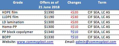 A major Saudi Arabia producer has announced July PP and PE shipment offers to Southeast Asia market at mostly softer levels compared to last month. Largest cut is seen in LLDPE film of $30/ton, which is in line with the maker’s previous report of increasing supply for this grade.