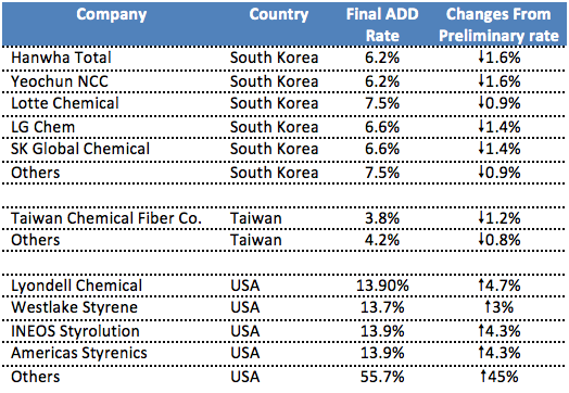 The final rates see some downward adjustments to the duties imposed on South Korean and Taiwanese SM makers while USA witness an increase of 3-45% compared to the preliminary rate.