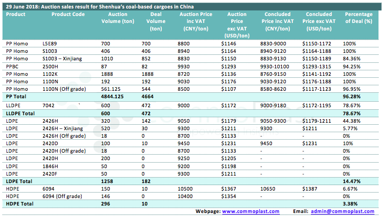 Auctions sales result for Shenhua’s coal-based polyolefin products in domestic China are as following: