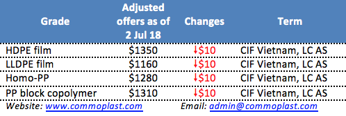Vietnamese buyers on the first trading day of the week reported receiving adjusted PP and PE offers for July shipment from a major Saudi Arabia producer. Latest price list showed $10/ton reduction for all grades and active deals have been achieved, especially for LLDPE film.