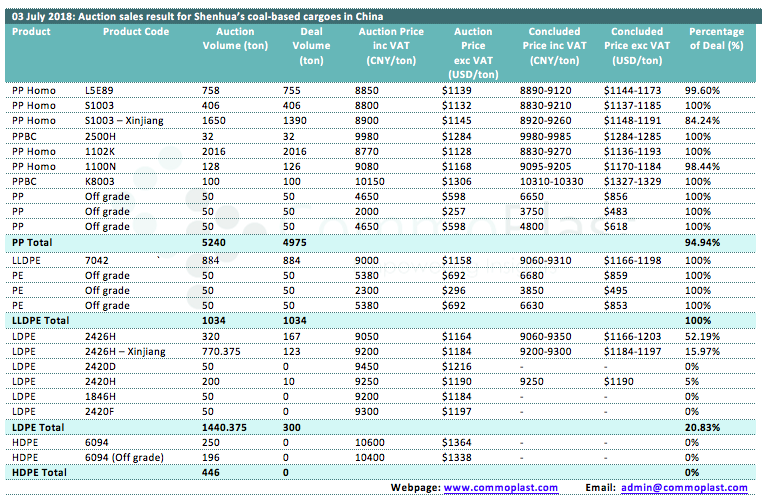 Auctions sales result for Shenhua’s coal-based polyolefin products in domestic China are as following: