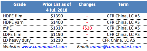In fact, Chinese buyers reported having purchased these cargoes at $1350/ton or HDPE film, $1360/ton for HDPE yarn, $1150/ton for LDPE film and at $1170/ton for LDPE heavy duty, all based on CFR China, LC AS term.