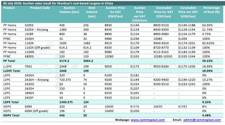 Auctions sales result for Shenhua’s coal-based polyolefin products in domestic China are as following: