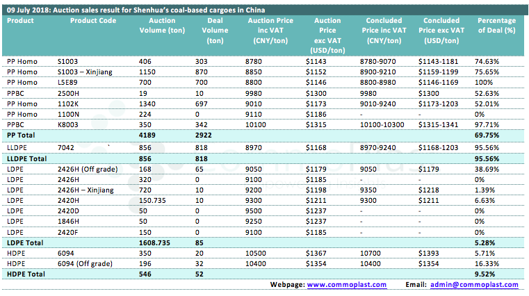 Auctions sales result for Shenhua’s coal-based polyolefin products in domestic China are as following: