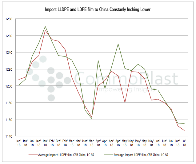 The import PE market in China has been persistently following a softening trend since early May, after players returned from the long Labour Day holidays. This week, import LLDPE and LDPE film to China hit the lowest levels since beginning of November 2017 and sources fear that this trend could persist in the coming days.
