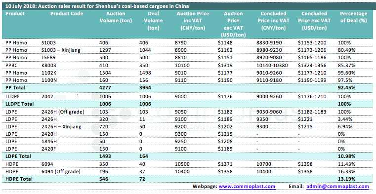 Auctions sales result for Shenhua’s coal-based polyolefin products in domestic China are as following: