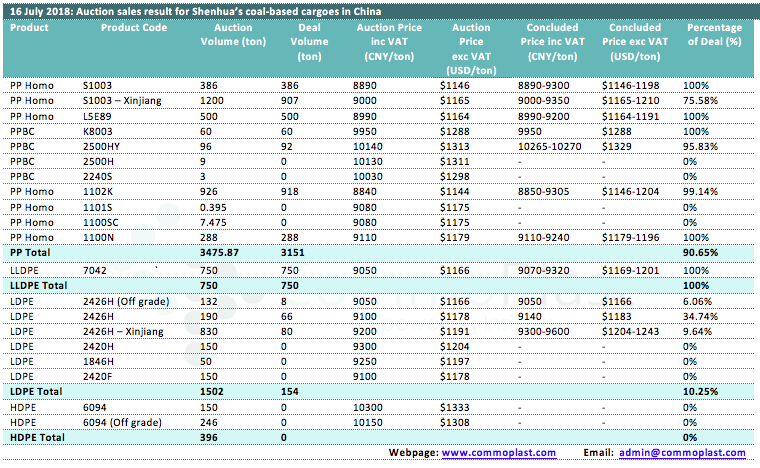 16 July 2018: Auction sales result for Shenhua's coal-based cargoes in China
