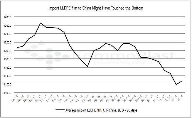 Nine weeks of constantly following the downtrend, import LLDPE film to China might have found the floor this week. Data from CommoPlast suggested that the average value for import LLDPE film to China shredded nearly $100/ton over a period from the third week of May to the second week of July due to persistently sluggish demand condition.