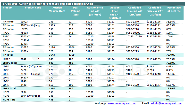 Auctions sales result for Shenhua’s coal-based polyolefin products in domestic China are as following: