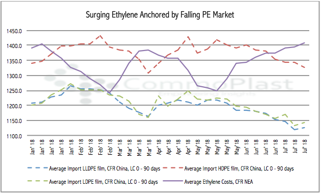 CommoPlast data suggests that the average import HDPE film to China is now about $80/ton below ethylene cost while the average LLDPE film and LDPE film prices are about $260-270/ton into the negative zone. “Chinese customers are resisting the current ethylene levels, which might curl the uptrend,” an industry source commented.