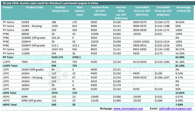 20 July 2018: Auction sales result for Shenhua's coal-based cargoes in China