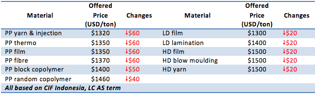 Malaysian maker slashed August shipment offers for PP, PE to Indonesia