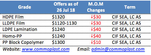 Another Saudi Arabia producer implemented reductions on August shipment offers for PP and PE to Southeast Asia market, following the general trend across the region. The maker’s latest price list and changes are shown in the following table: