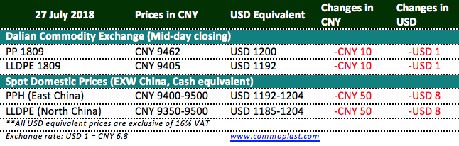 On the final trading day of the week, Dalian Commodity Exchange remains on a soft note. Entering the break-time, September delivery contract for both PP and LLDPE loses CNY10/ton.