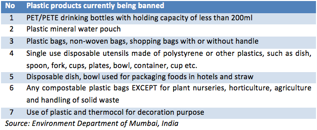 The following table extracted information from a guidebook for plastic and thermocol ban circulated by the Department of Environment, Government of Maharashtra, India.