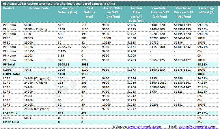 03 August 2018: Auction sales result for Shenhua's coal-based cargoes in China