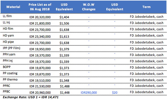 Indonesian buyers in the first trading day of the week reported receiving fresh offers for PP and PE from a major local producer at mostly unchanged levels from the previous week. However, most sources are hoping to see a fresh round of forward selling, especially for homo-PP, at larger than usual discounts.