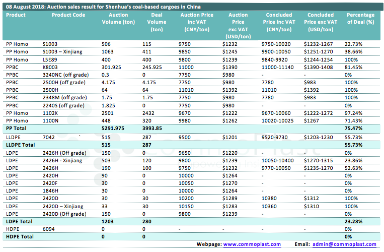 Auctions sales result for Shenhua’s coal-based polyolefin products in domestic China are as following: