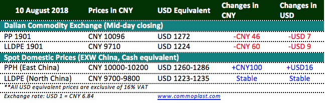 Inventories at Sinopec and CNPC’s warehouses have not changed after a surge in the previous day. PP and PE remain at 680,000 tons as on 10 August 2018, sources informed.