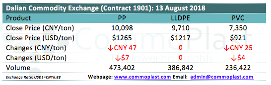 Dalian Commodity Exchange: 13 August 2018