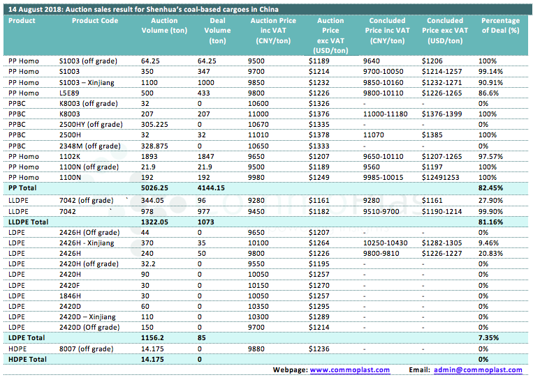 14 August 2018: Auction sales result for Shenhua's coal-based cargoes in China