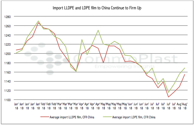 In three weeks time, the average import LLDPE film and LDPE film to China have gained an approximate $50/ton and $55/ton respectively, data from CommoPlast Price Index suggested.