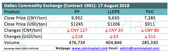 Contract number 1901 on Dalian Commodity Exchange on 17 August 2018 settled as following: