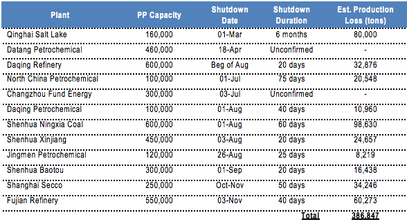 Domestic supply for PP and PE in China is expected to remain tight throughout August and first half of September due to heavy maintenance shutdown schedule during this period.
