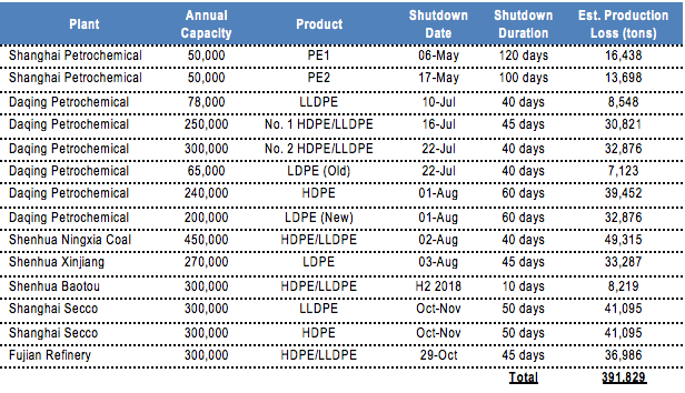 Following tables presented detailed maintenance schedules at major PP and PE plants in China.