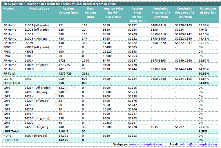 20 August 2018: Auction sales result for Shenhua's coal-based cargoes in China