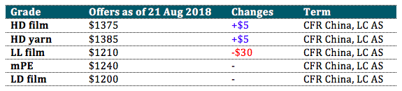 A trader commented, “Our supplier seems no pressure on their HDPE cargoes, however stepped back on their LLDPE offers this week due to weaker domestic and futures market recent days. We are still waiting for feedback from customers, however responses from the market are rather slow.”