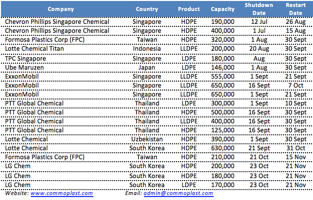 In an update for planned maintenance shutdown at major PE producers in Asia for the second half of the year, ten (10) major makers are taking their plant off-stream, some with multiple lines.