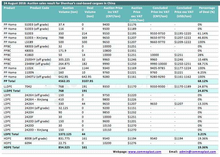 Auctions sales result for Shenhua’s coal-based polyolefin products in domestic China are as following: