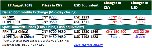 Total inventories at Sinopec and CNPC’s warehouses piled up 100,000 tons from last Friday to 835,000 tons as on 27 August 2018.