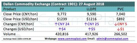 Contract number 1901 on Dalian Commodity Exchange on 27 August 2018 settled as following: