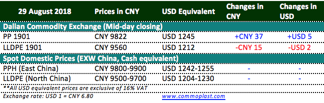 In an interesting note, total PP and PE inventories at Sinopec and CNPC’s warehouses fell 35,000 tons day-on-day to 755,000 tons as of 29 August 2018. Sources informed that most of these quantities are pushed to distribution market as part of the producers’ month end stock-count.