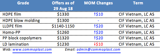Another major Saudi Arabia producer has announced September shipment offers to Vietnam mostly at firmer levels compared to last month, except for LDPE lamination grade that drop $10/ton.