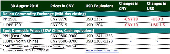 Total PP and PE inventories at Sinopec and CNPC’s warehouses fell 20,000 tons day-on-day to approximate 735,000 tons as of 30 August 2018. Distributors and traders reportedly take most of the quantity.