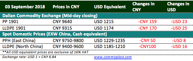 By the mid-day closing time, January delivery contract for both PP and LLDPE on Dalian Commodity Exchange loses three digits in value, which in turn depressing the spot ground.